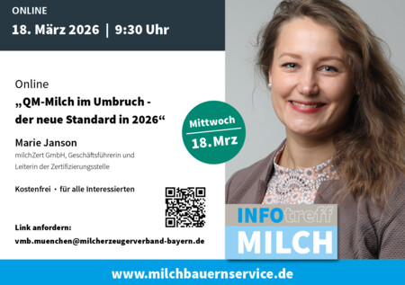 Unter dem Thema „QM-Milch im Umbruch – der neue Standard 2026“ wird Frau Janson, Geschäftsführerin der milchZert GmbH, bei der kommenden Online-Veranstaltung die wichtigsten Änderungen im Detail vorstellen.